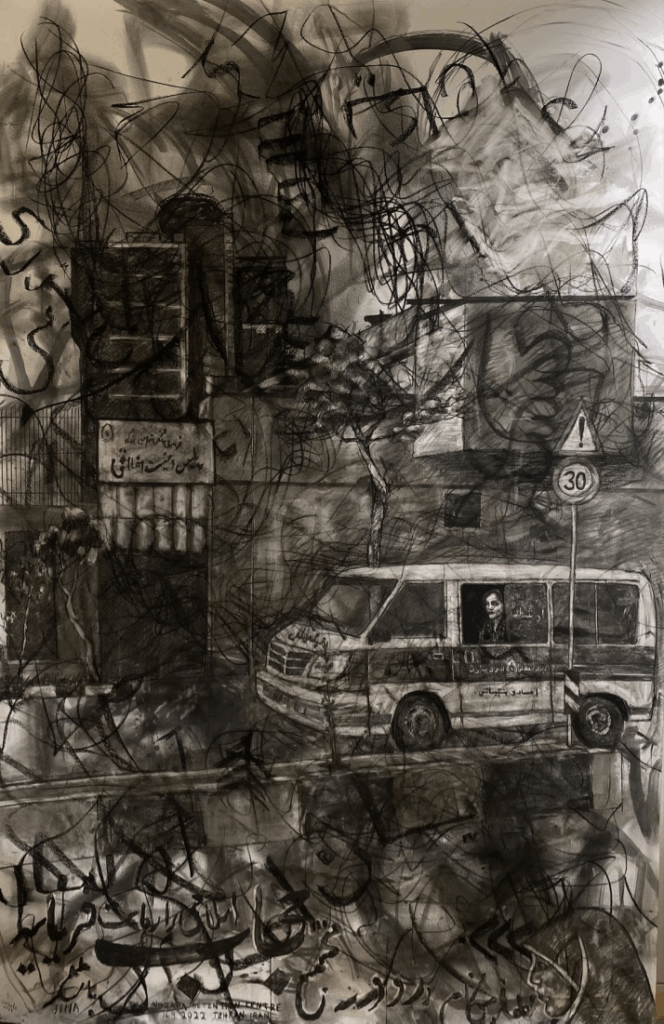 From the series Requiem: “JINA (Mahsa)”, 230 x 150 cm, charcoal on Fabriano paper, 2024.