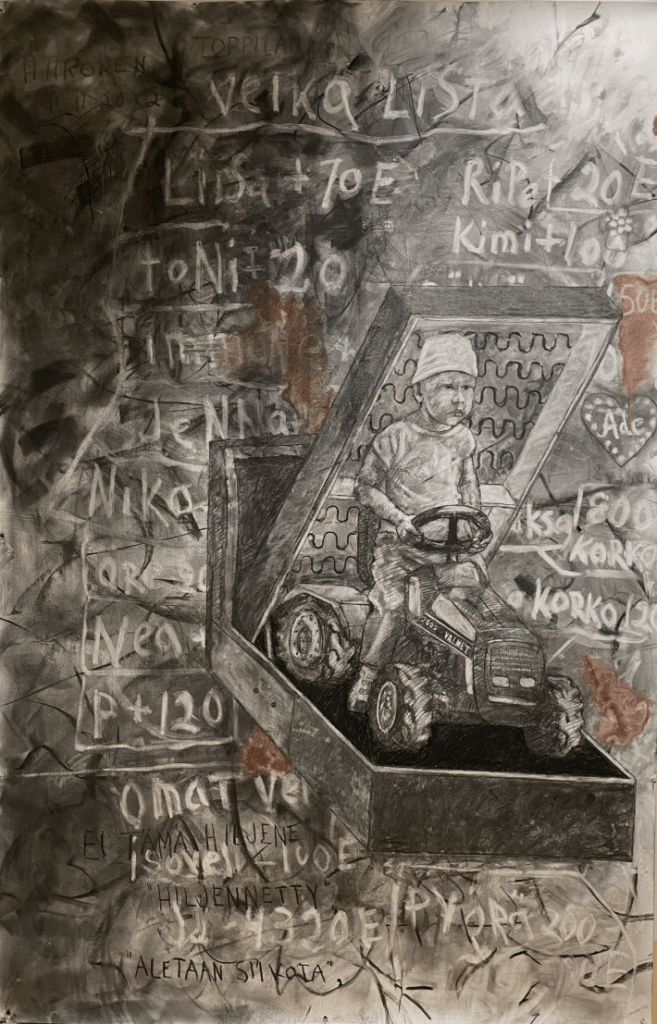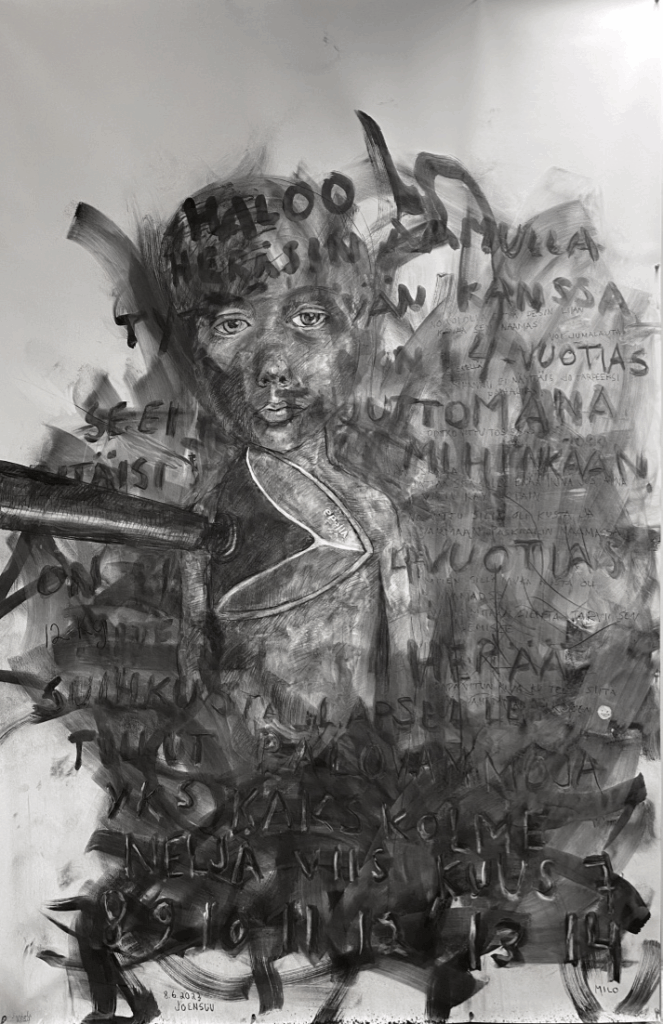 Mikä on oma motiivini kuvata näitä kärsimyksen hetkiä ja rakenteita? Sitä en itsekään varmuudella tiedä, mutta ainakin teokseni pakottavat katsomaan asioita ja tapahtumia, joita ei haluttaisi nähdä. Esimerkiksi syrjäytyneiden narkomaanien itselleen ja toisilleen aiheuttamaa kärsimystä, joka olisi helpompi unohtaa kuin kohdata. Henkilökohtaisessa elämässä narkomaanien todellisuus on tullut lähelle, kun muutin viitisen vuotta sitten Kurviin. Heidän vaikea elämäntilanteensa ja väkivaltainen todellisuus on läsnä joka päivä. Mietin pitkään, miten voisin kuvata heitä kauniisti, että heitä ei unohdettaisi ja erityisesti lapsia jotka kasvavat vaikeissa olosuhteissa. Viimeistään siinä vaiheessa päätin tehdä näitä teoksia, kun kotikulmilleni tehtiin yhteiskunnan toimesta ns. siivouskampanja. Roskia siivotaan, ei ihmisiä. Jokainen narkomaani on jonkun lapsi. Vaadin inhimillistä kohtelua jokaiselle ja muutosta hallituksen sosiaalipolitiikkaan. Todellisuutta pakoileva taide jättää kaltoinkohdellut yksin, vaille empatiaa, kanssakärsimistä. Eskapistisen taiteen sijaan pyrin kysymään aina uudelleen: ”Millainen maailma on? Pyrin kuvaamaan taiteessani maailmaa juuri niin raadollisena kuin sen kohtaan. Unohtamisen sijaan teen kuvia muistettavaksi. Siksi piirrän narkomaaneja, tapettuja lapsia ja sodan kauhuja.