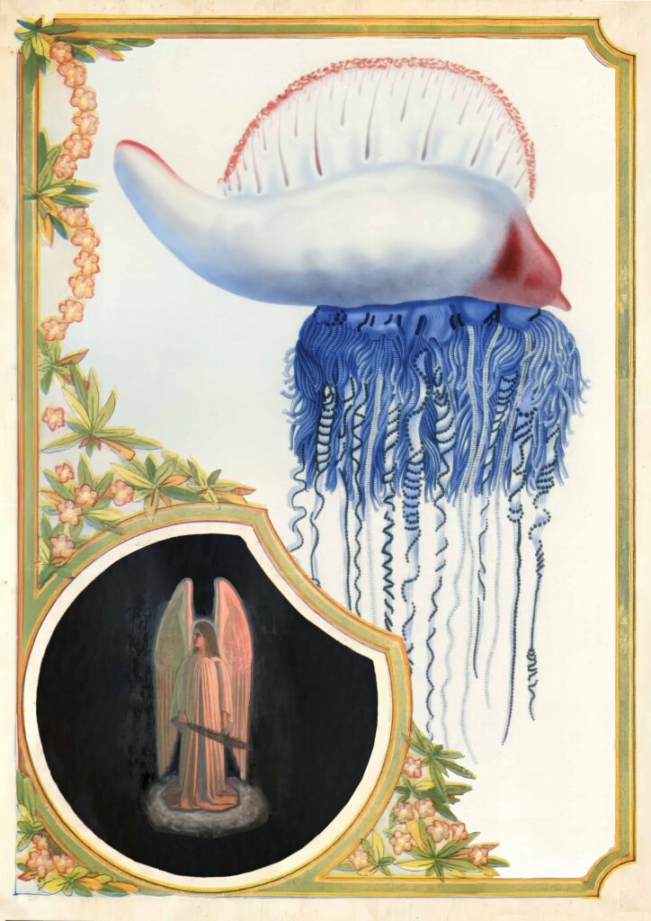 The collages are composed of source material gathered at flea markets and museum archives. Their fragments, 70 to 130 years old, are reassembled into new wholes where sharp-edged nostalgia intersects with the present, and where beauty, strangeness, and critical reflection coexist.