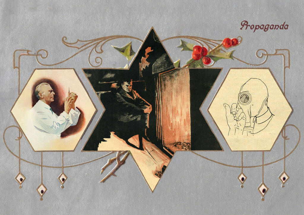 At first glance, the works recall vintage posters, but their themes are urgently contemporary: environmental crisis, militarism, shifting values. Art Nouveau–inspired ornamentation adds an uncanny layer that both attracts and unsettles. The convincing poster-like style is deliberate — the more persuasive the image appears, the more effectively it destabilizes the viewer’s assumptions.